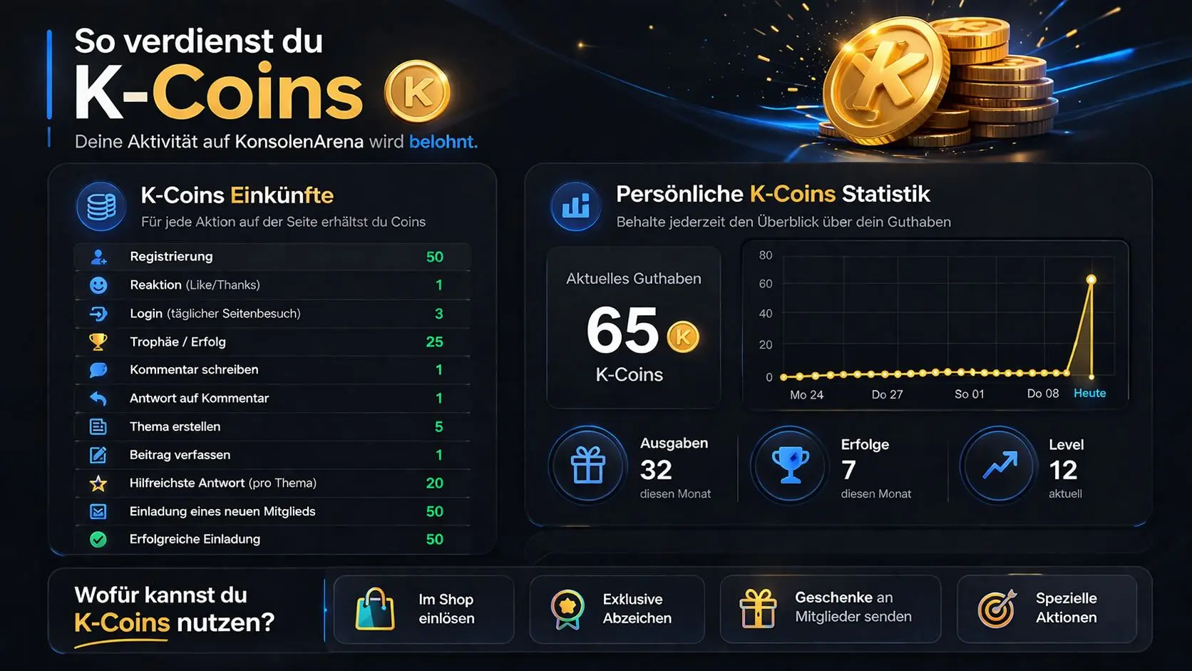 Neben klassischen Forenfunktionen möchten wir moderne Ansätze integrieren, die Aktivität sichtbar machen und die Beteiligung fördern. KonsolenArena setzt daher bewusst auf Gamification-Elemente, die nicht als Spielerei gedacht sind, sondern als Erweiterung des Community-Gedankens.
